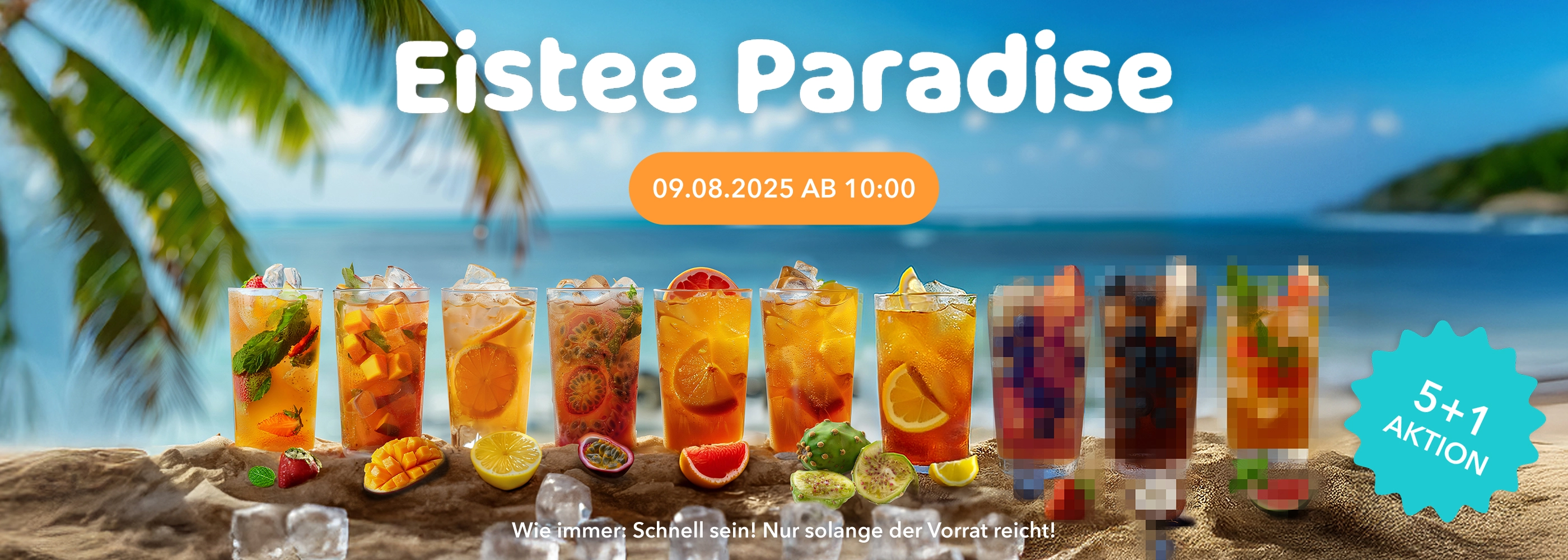Am 9. August kommt nicht nur die neue "Eistee Paradise" Edition mit 10 ausgefallenen Eistee-Sorten, sondern auch die Einführung einer 5+1 Aktion, bei der der Kauf von fünf Boxen eine sechste GRATIS einschließt. Das macht das Angebot noch verlockender und lädt dazu ein, den Sommer so lecker und ausgefallen wie noch nie zu genießen.